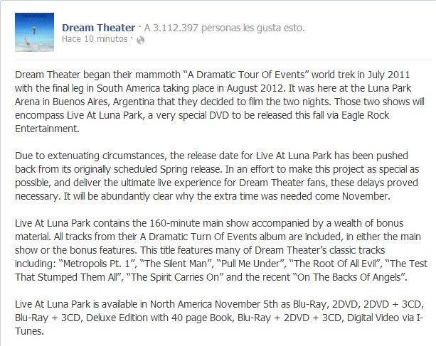 No, no leyeron mal. lo que muchos temíamos finalmente se anunció. aunque la espera será mucho mayor, esta vez es confirmadísimo, Live At Luna Park será lanzado oficialmente el 5 de Noviembre en los Estados Unidos. DT en su cuenta oficial de facebook dió el siguiente comunicado: